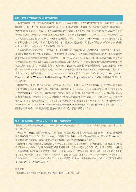 本報告では、まず、劇団員自身によって書かれた、市川升十郎『かぶき人生』(1983年、豊文堂)、市川梅香『まつば牡丹の記』(1993年、毎日新聞連載)、劇団員へのインタビューを中心に構成された黒川光弘『まぼろしの少女歌舞伎』(1984年、中日新聞連載)の記述を参照して劇団の概要を確認する。さらに、報告者の作成した市川少女歌舞伎上演年表を用いて、大劇場で上演された演目の傾向と変遷について考察を述べる。本報告を歌舞伎における、男性と女性、大人と子ども、都市と地方の関係を考えるきっかけとしたい。日本近代演劇デジタル・オーラル・ヒストリー・アーカイヴ(http://oraltheatrehistory.org/)で、報告者が取材者として関わった、劇団員の市川梅香、市川福升の聞き書きを公開している。事前に参照されたい。
